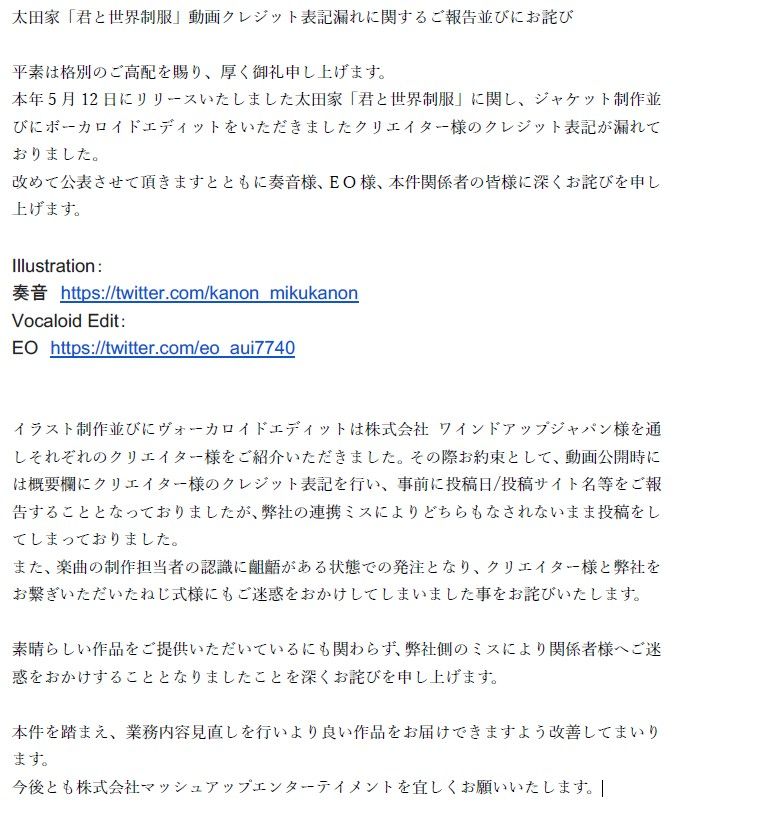 太⽥家「君と世界制服」動画クレジット表記漏れに関するご報告並びにお詫び